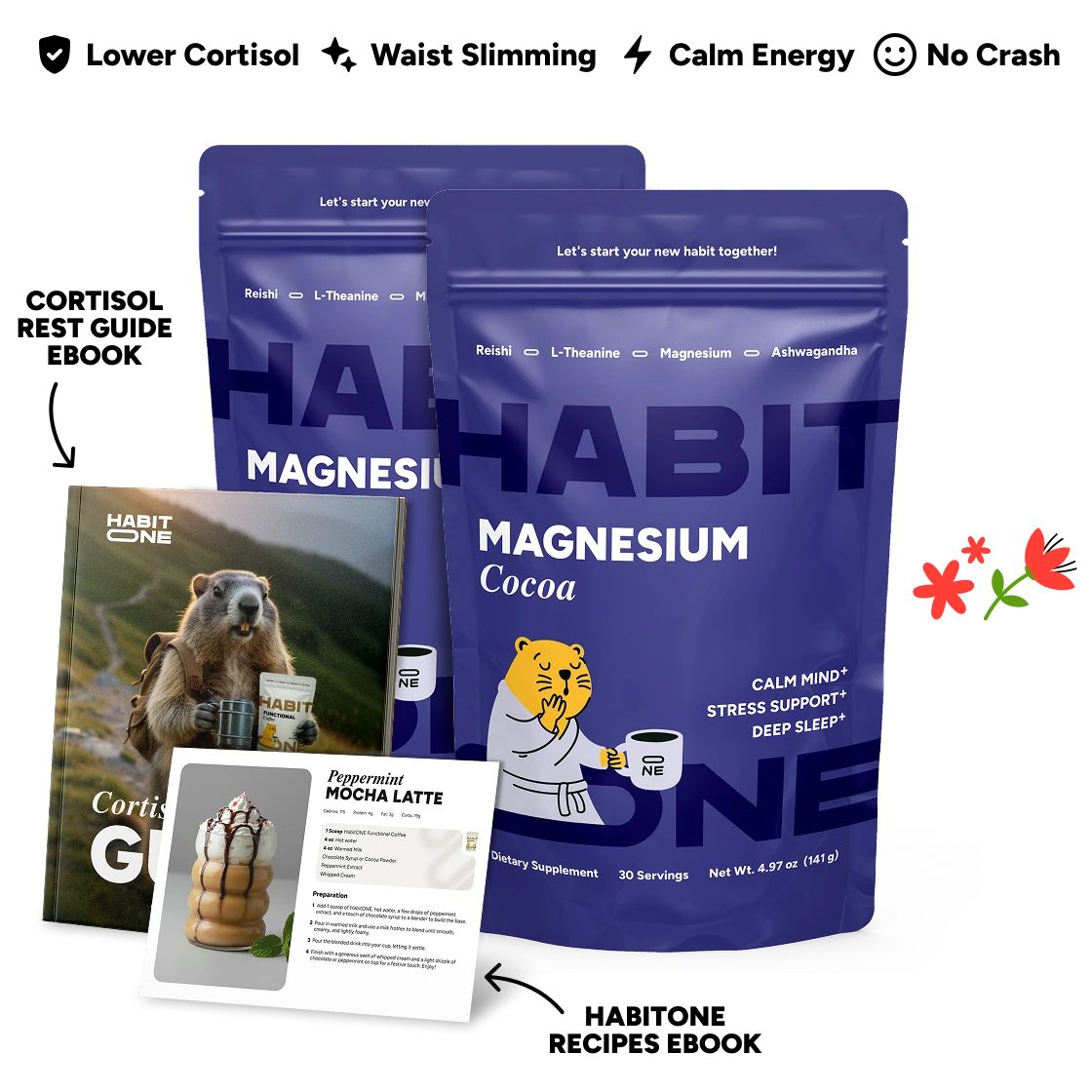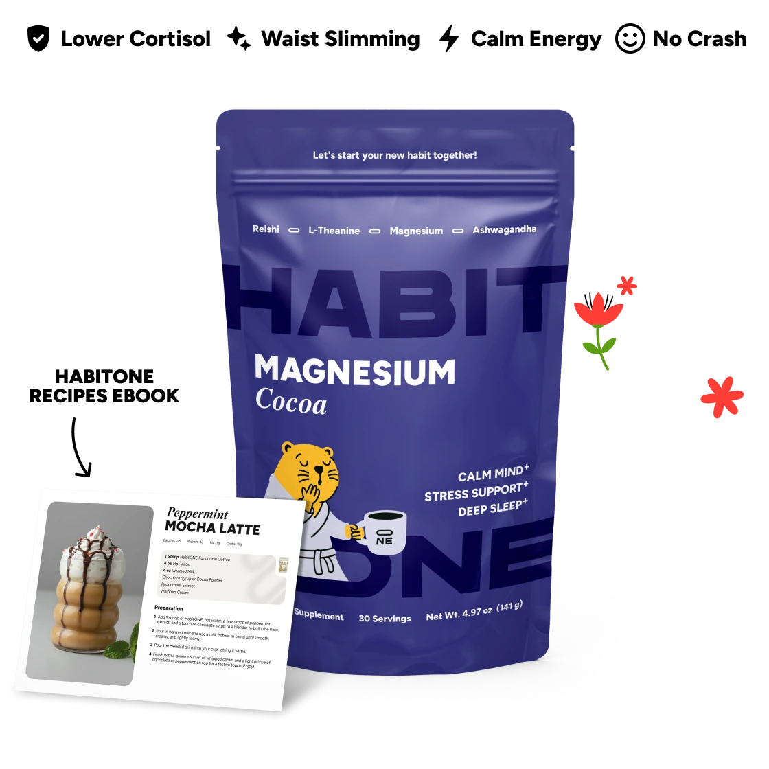 Stress throws multiple systems out of balance — your mind speeds up, your gut tightens, and cortisol stays elevated when it should be dropping. HabitONE Cacao works across these areas by soothing brain activity through L-Theanine & Reishi, easing gut tension with Cacao & Jujube, and helping normalize nighttime cortisol patterns with Ashwagandha.